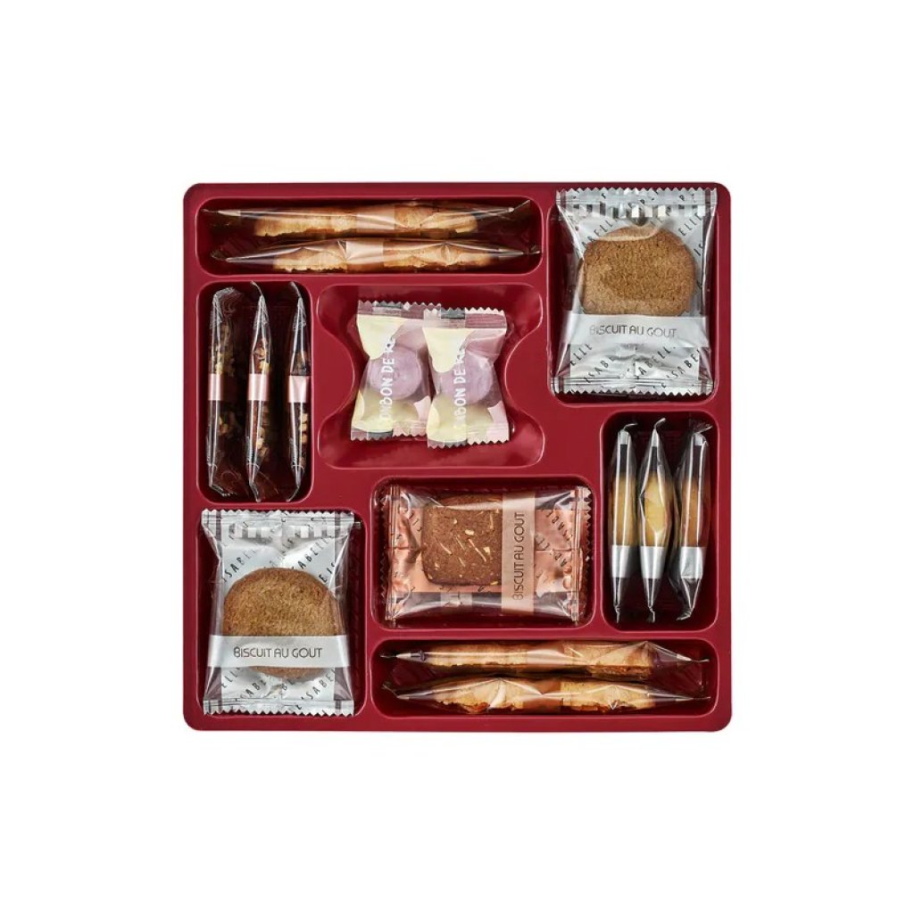 禮盒內容:阿薩姆茶曲奇 x 4, 焦糖杏仁船 x 4, 咖啡杏仁曲奇 x 2, 甜心牛油曲奇 x 3, 朱古力杏仁薄餅 x 3, 葡萄味水果糖 x 2