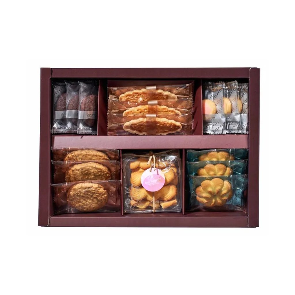 禮盒內容:紅莓紅酒曲奇 x 3, 焦糖杏仁船 x 3, 甜心牛油曲奇 x 3, 芝士棒 x 1 (9件), 錫蘭紅茶曲奇 x 3, 海苔脆曲奇 x 3