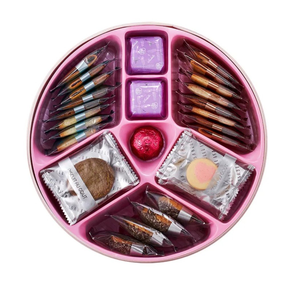 禮盒內容:阿薩姆茶曲奇 x 3, 椰絲朱古力曲奇 x 4, 甜心牛油曲奇 x 3, 雲呢拿味薄餅 x 8, 芝士薄餅 x 8, 藍莓味酥 x 2, 榛子味朱古力 x 1