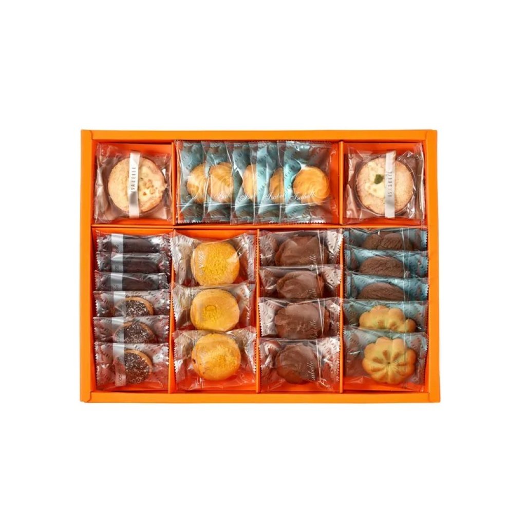 禮盒內容:紅莓紅酒曲奇 x 3, 鹹蛋黃曲奇 x 5, 朱古力脆圈 x 3, 椰絲朱古力曲奇 x 3, 海苔脆曲奇 x 2, 雙重朱古力夾心 x 4, 椰香杏仁酥 x 2, 芒果酥 x 3