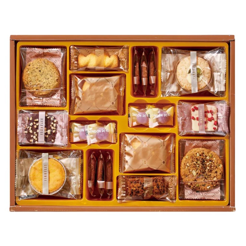 禮盒內容:錫蘭紅茶曲奇 x3, 朱古力杏仁薄餅 x4, 青蘋果小蛋糕 x2, 芝士棒 x2, 微鹹芝士夾心 x4, 葡萄味水果糖 x8, 咖啡杏仁曲奇 x6, 咖啡酥 x2, 椰香杏仁酥 x2, 香草莓果薄餅 x4, 咖啡全麥手製曲奇 x3