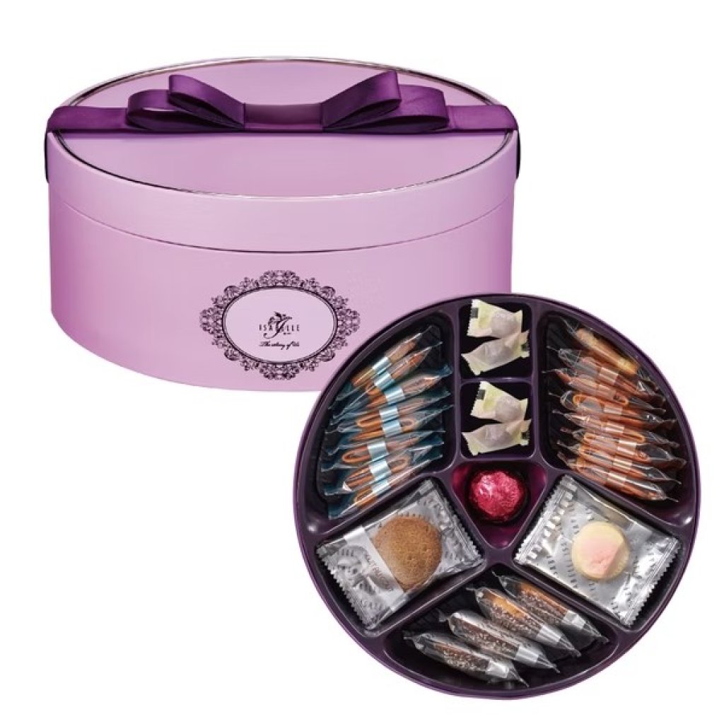 禮盒內容:阿薩姆茶曲奇 x 3, 椰絲朱古力曲奇 x 4, 甜心牛油曲奇 x 3, 雲呢拿味薄餅 x 8, 芝士薄餅 x 8, 藍莓味酥 x 2, 榛子味朱古力 x 1